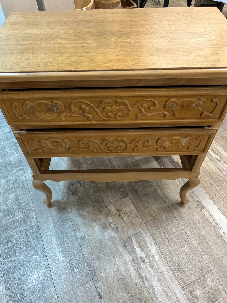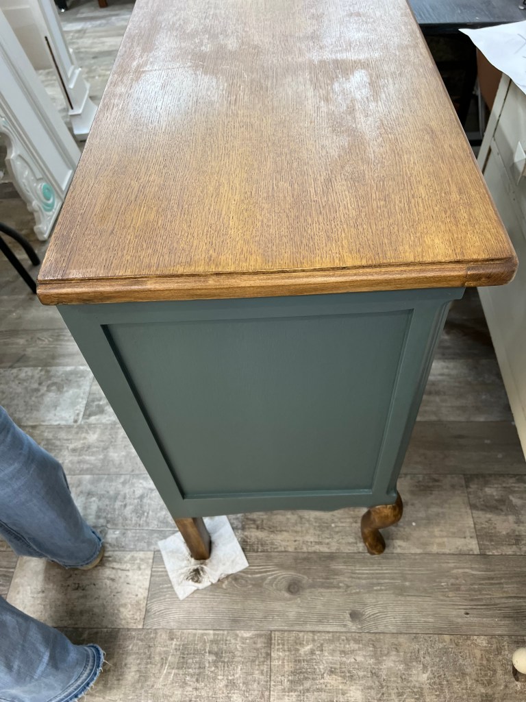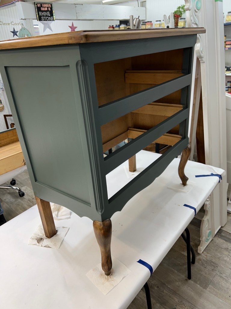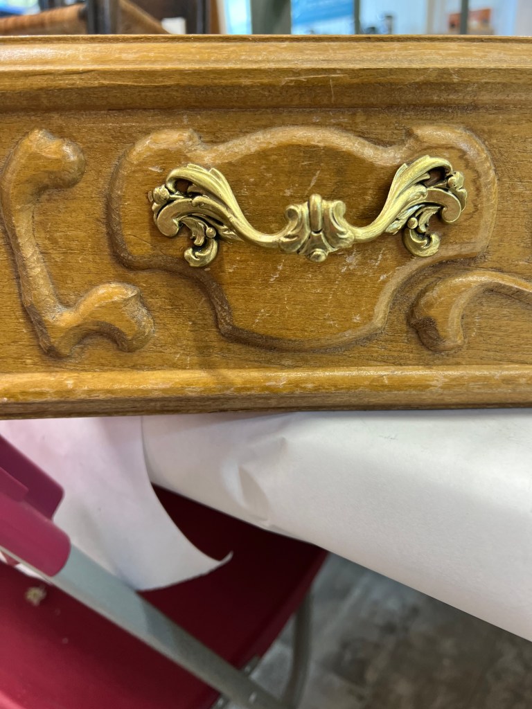 The first is a Louis the 16th style 3 drawer chest that was pretty when she came to us but needed some repairs and love to really shine. Marie combined Dixie Belle Silk Smokey Mountain and Golden Ash No Pain Gel Stain along with some new paints and stencils from Redesign With Prima to really dress it up.