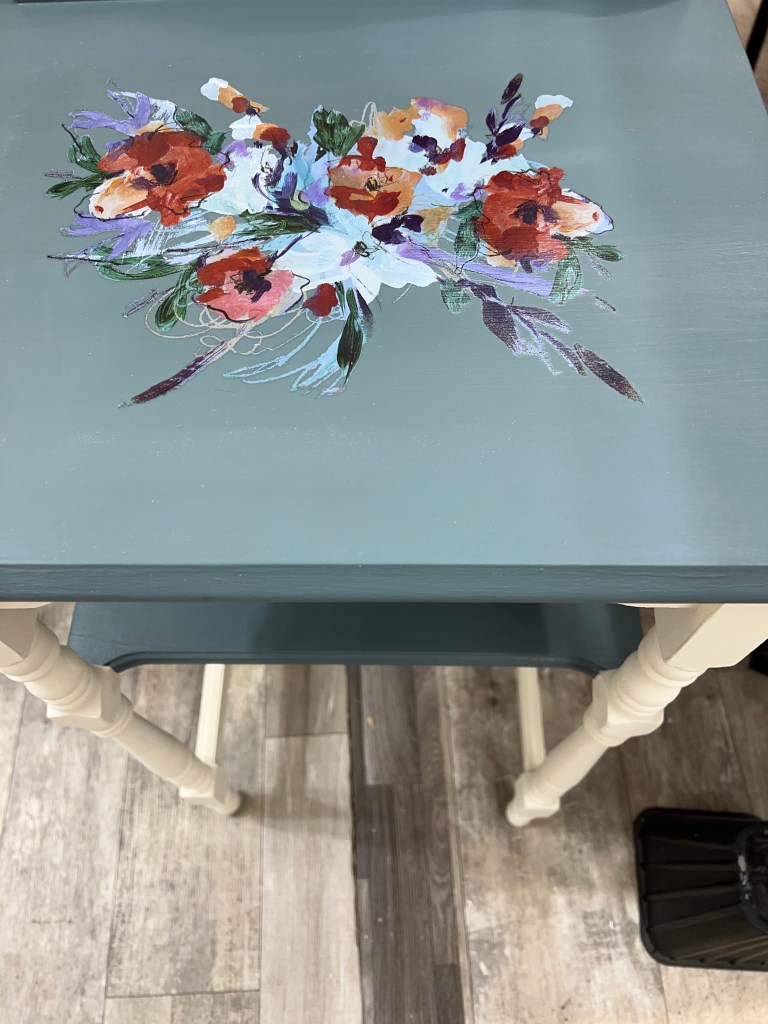 The next project is a pice for a vendor friend of ours who had a piece and really wanted it to shine. Marie added 2 H2O transfer called Radiant Blooms from Redesign With Prima. These H2O transfers are like model decals; get them and the piece wet, lightly rub to apply and wait 3 minutes to make your piece truly beautiful.