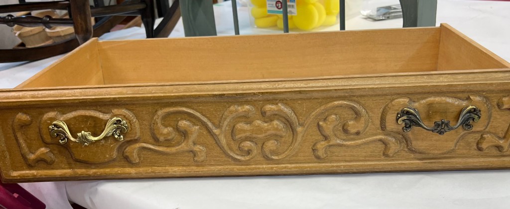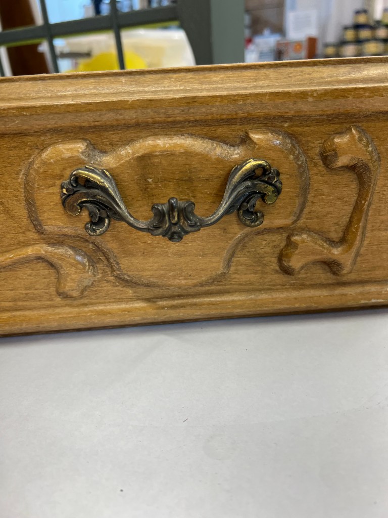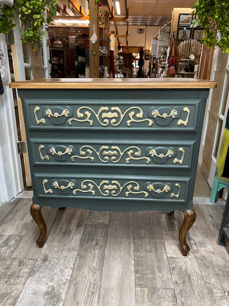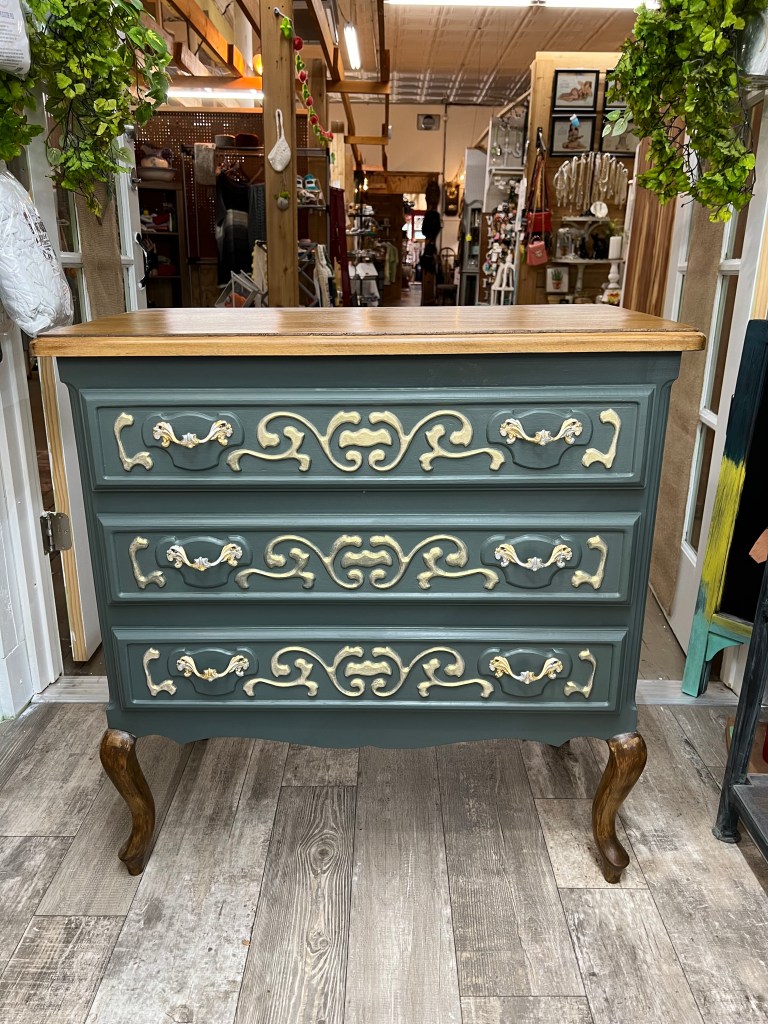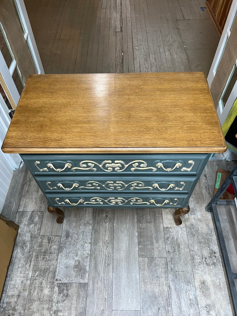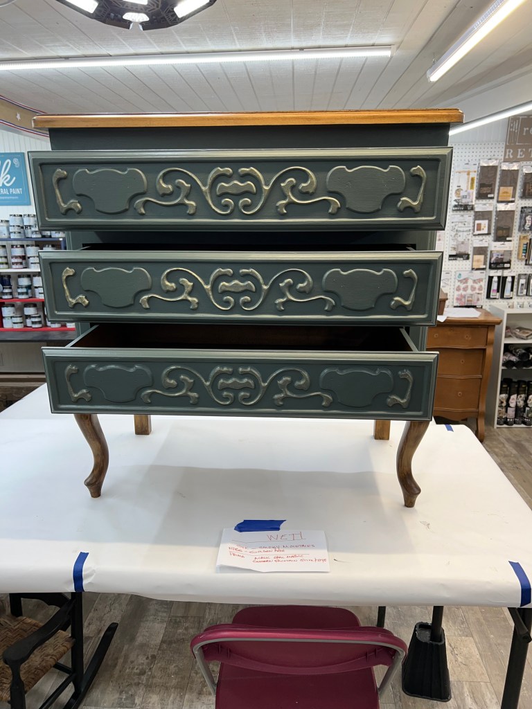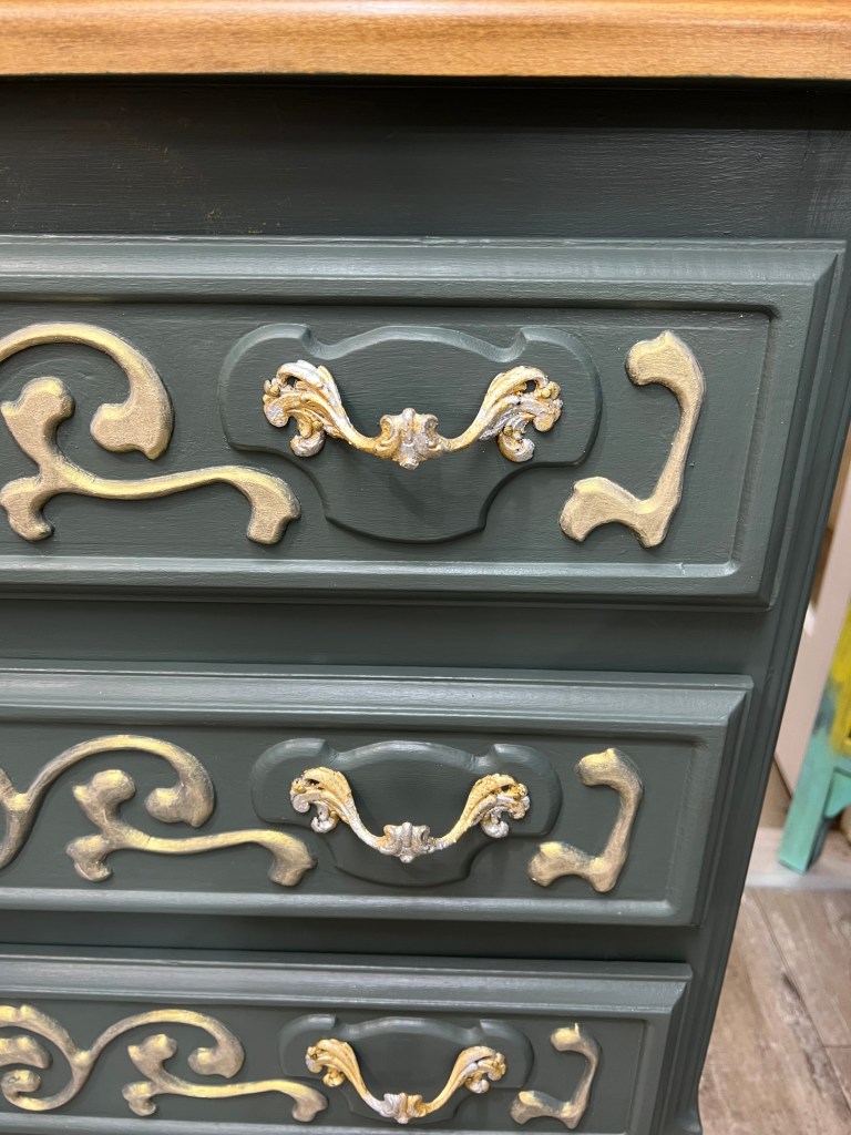 We picked up this Louis the 16th style 3 drawer small chest at auction and Marie loved the lines of the piece. But like every piece, Marie needed to let the piece speak to her about what would make it fabulous. When you are doing a piece to put into the shop as opposed to a custom order for a customer, you can take the time to make it your vision; and that’s exactly what Marie did. The piece was in great shape with no damage so it was mostly the painting, staining, transforming the handles and finally sealing the piece.