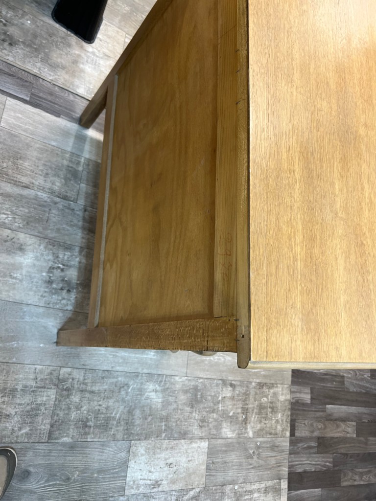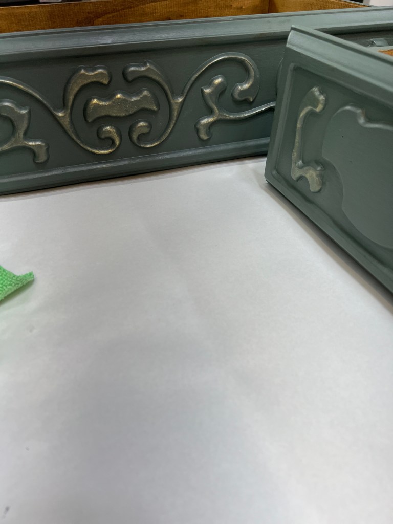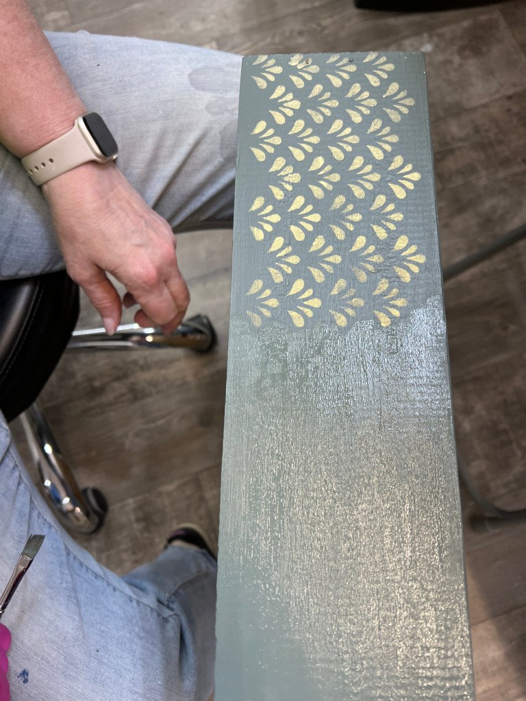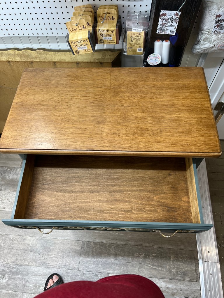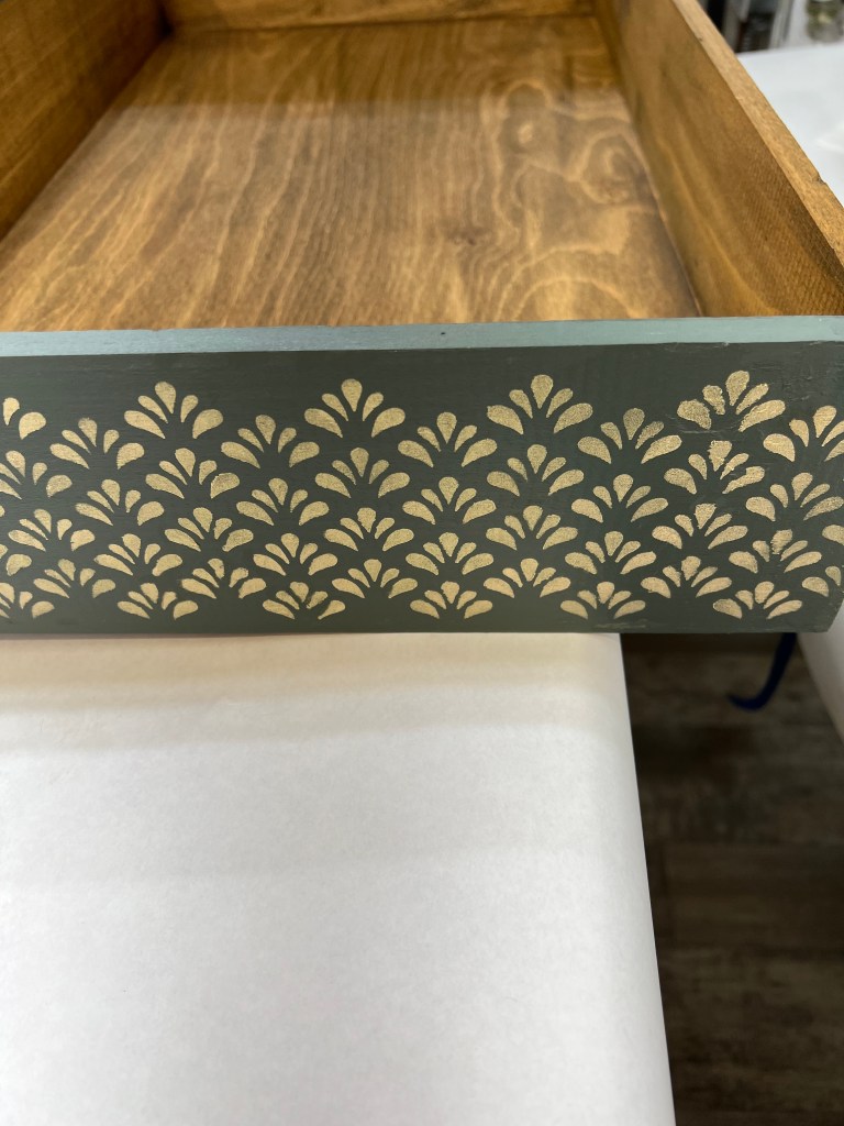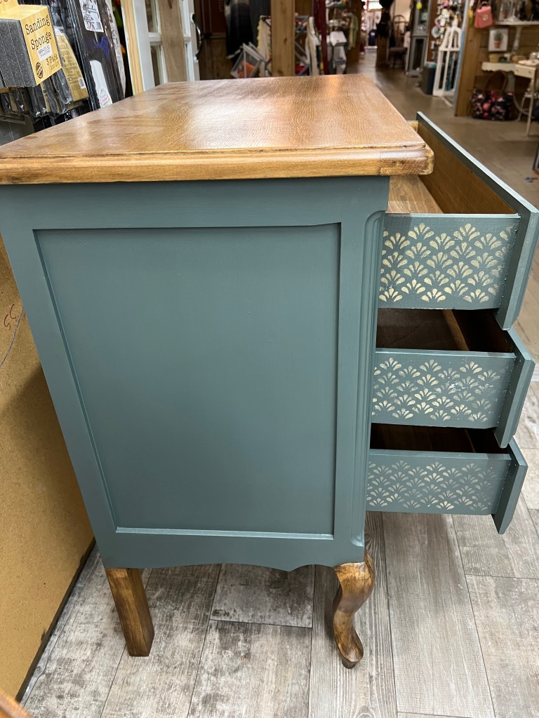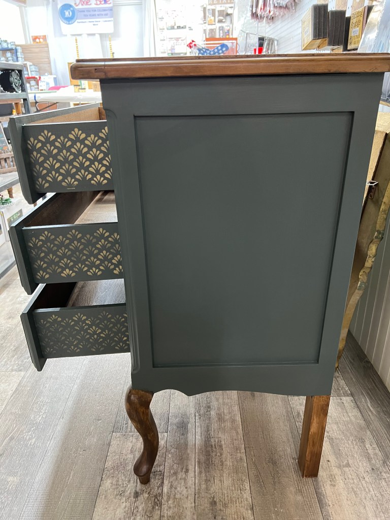 Marie used Dixie Belle Silk Smokey Mountain for the body, Dixie Belle No Pain Gel Stain Golden Ash for the top, legs and drawer insides; Redesign With Prima Opal Magic Acrylic Rose Gold Paint on the drawer fronts and sides (Eastern Fountain Stick & Style stencil roll on the drawer sides) and Sparkling Metallic Flakes for the handles. She finished the piece with Dixie Belle Clear Coat Satin and added Gator Hide sealer just for the top for extra protection.