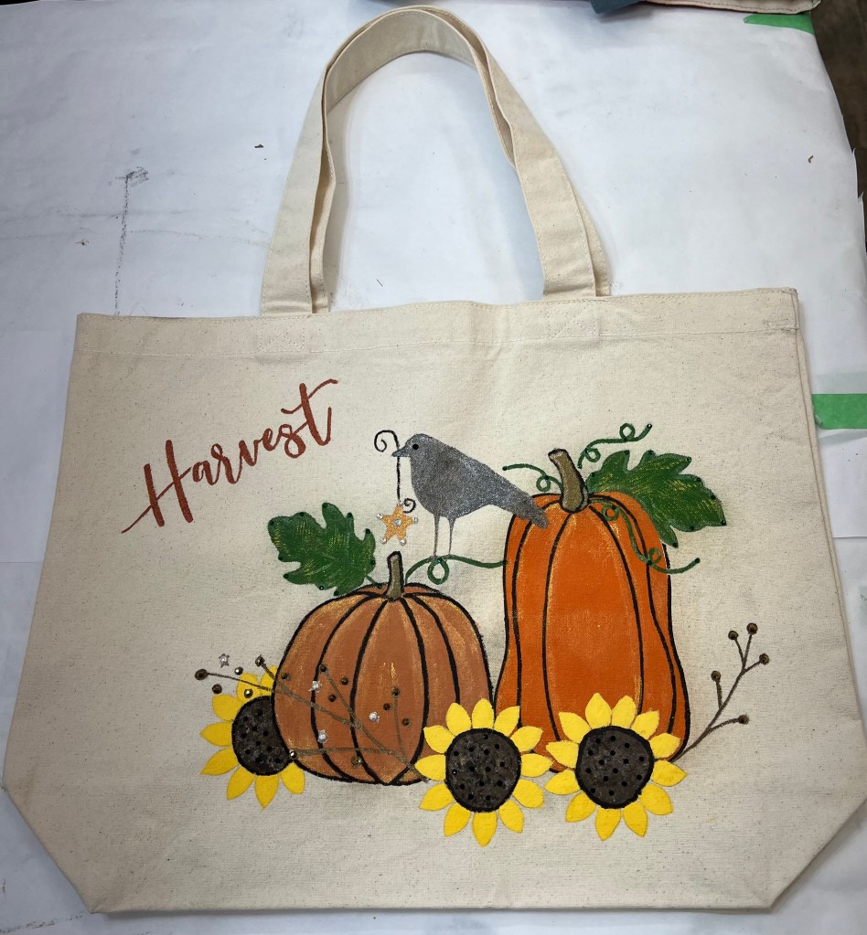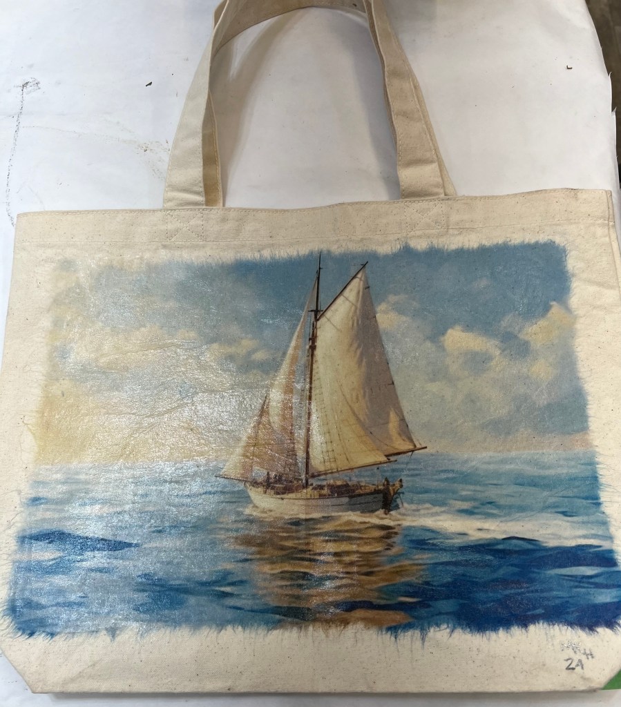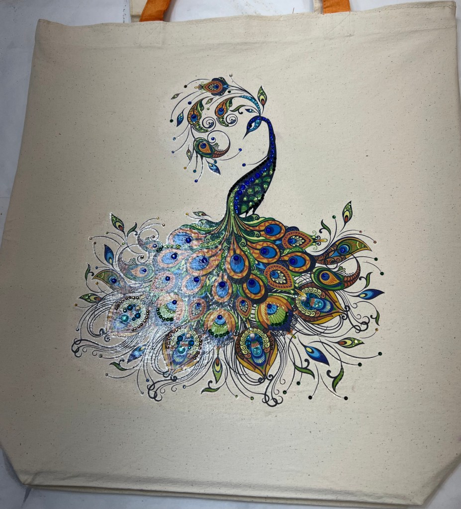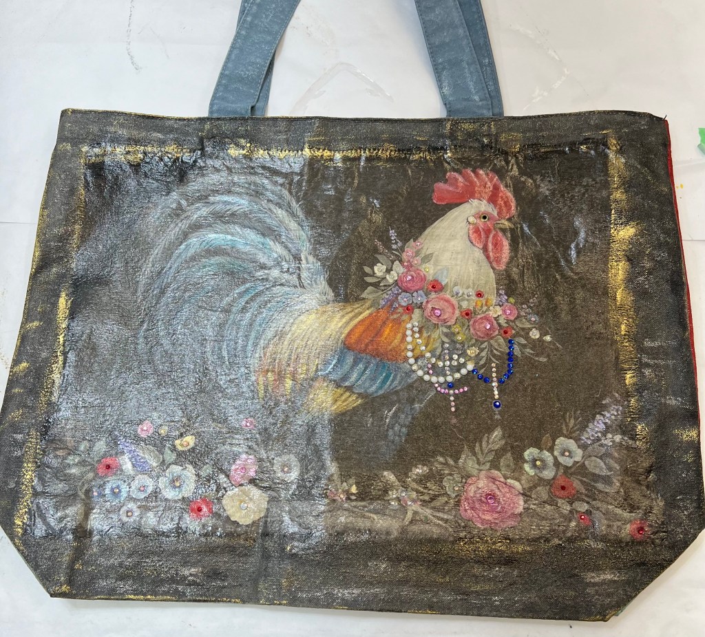Marie has been doing some amazing decoupage work on furniture but she’s expanded it to canvas shopping bags. We also were able to apply transfers to a canvas bag after using gesso on the bag before application. And finally, marie has started to bedazzle everything, including the bags. One of our next classes will be using these techniques; keep your eyes on our pages to see dates and times.