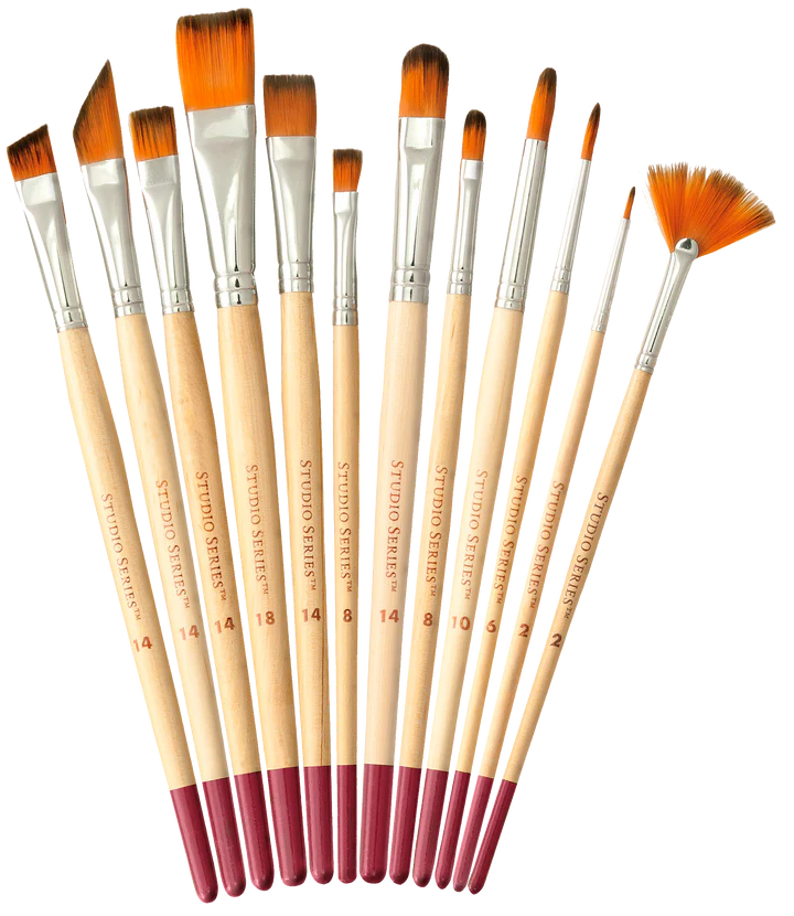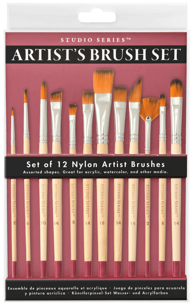 - Set of 12 brushes includes a versatile range of shapes and sizes for fine detail work, broad-area coverage, and texturing.